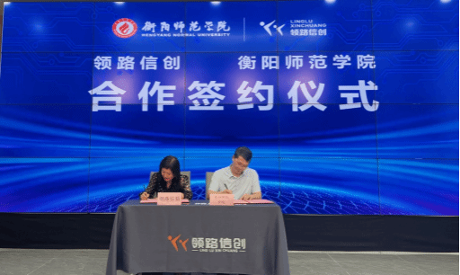 党委书记陈晓飞(右)代表学校与长沙领路信创科技有限公司签订就业实训合作协议